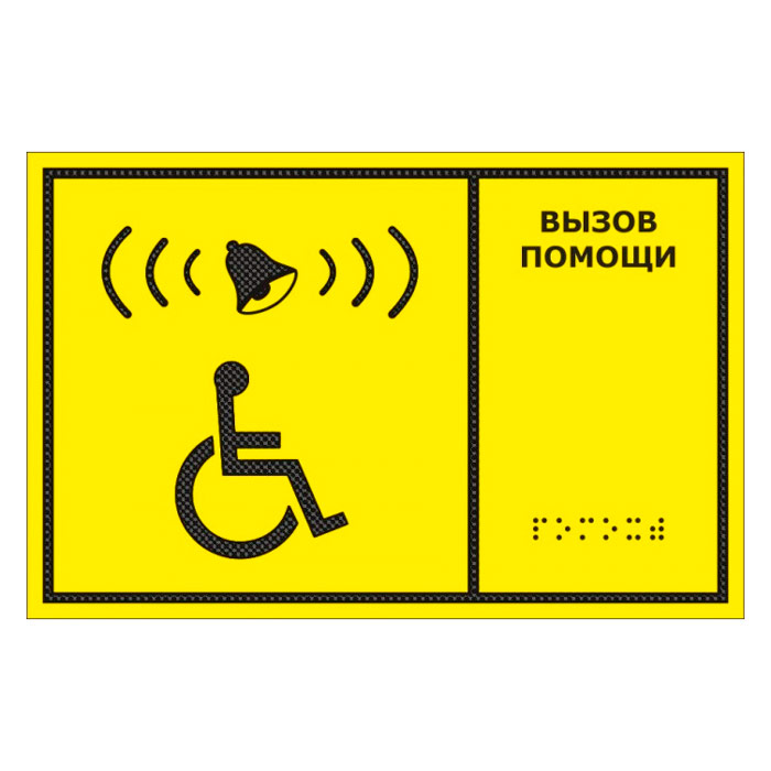 Табличка служит для кнопки вызова. Имет рельефный знак и плоско-выпуклую надпись «Вызов помощи» с дублированием азбукой Брайля.